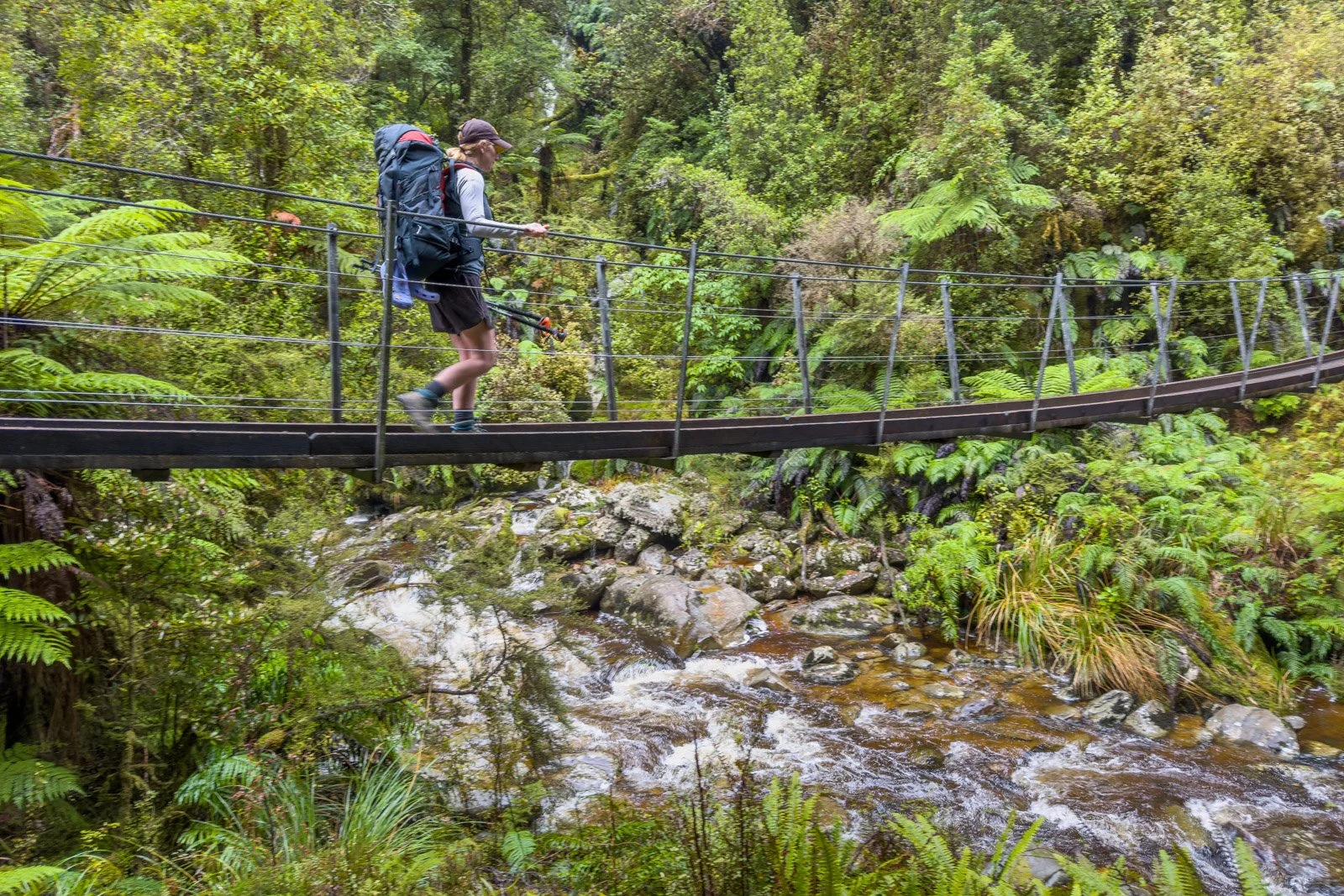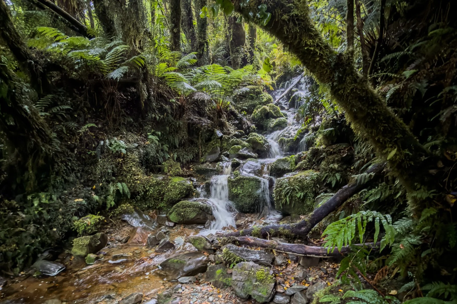 The trail begins alongside Blackball Creek before crossing back and forth via a series of one-person swing bridges. This section feels lush and distinctly rainforest-like, especially as we’d had decent rainfall the night before, which meant the rivers and side waterfalls were pumping!